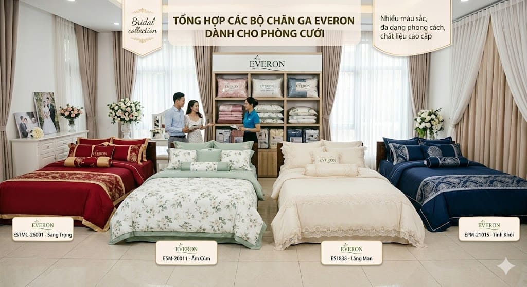 Nếu ngân sách cho phép, combo phòng cưới từ thương hiệu uy tín như Everon thường giúp đảm bảo đồng bộ và bảo hành rõ ràng.