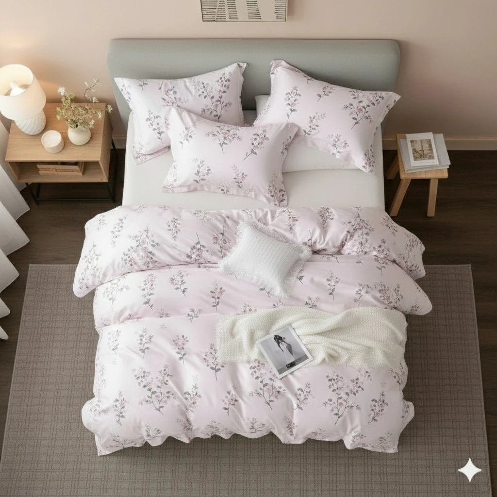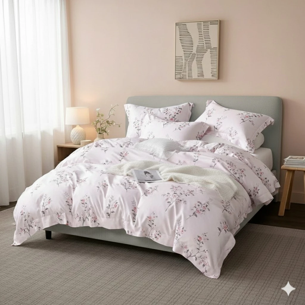 Sự kết hợp ga chun + chăn đồng bộ giúp tiết kiệm chi phí mà vẫn đảm bảo tính thẩm mỹ cao cho phòng ngủ.