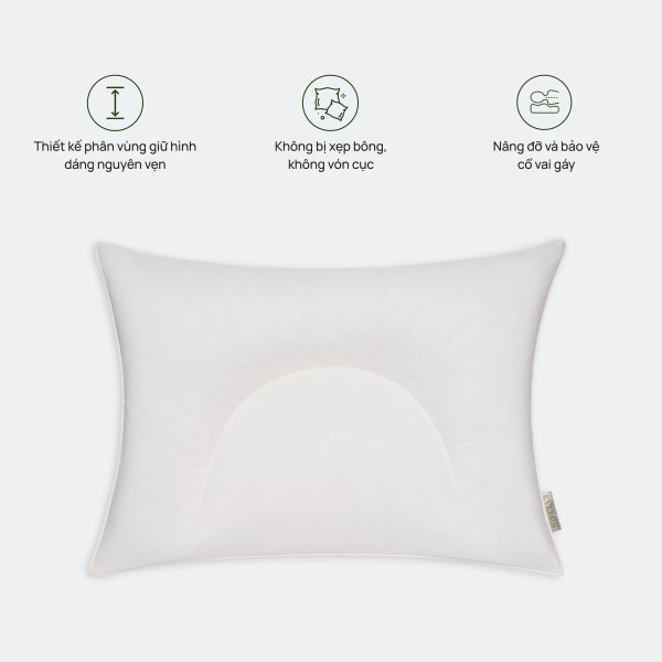 Thiết kế ruột gối giúp giữ cột sống cổ ở tư thế tự nhiên, giảm áp lực khi nằm lâu, hạn chế tình trạng đau mỏi, tê cổ vai gáy sau khi ngủ dậy.
